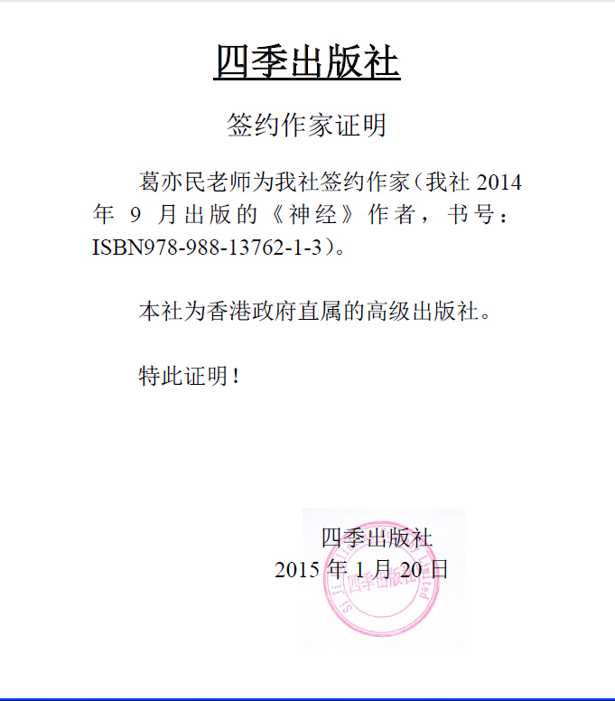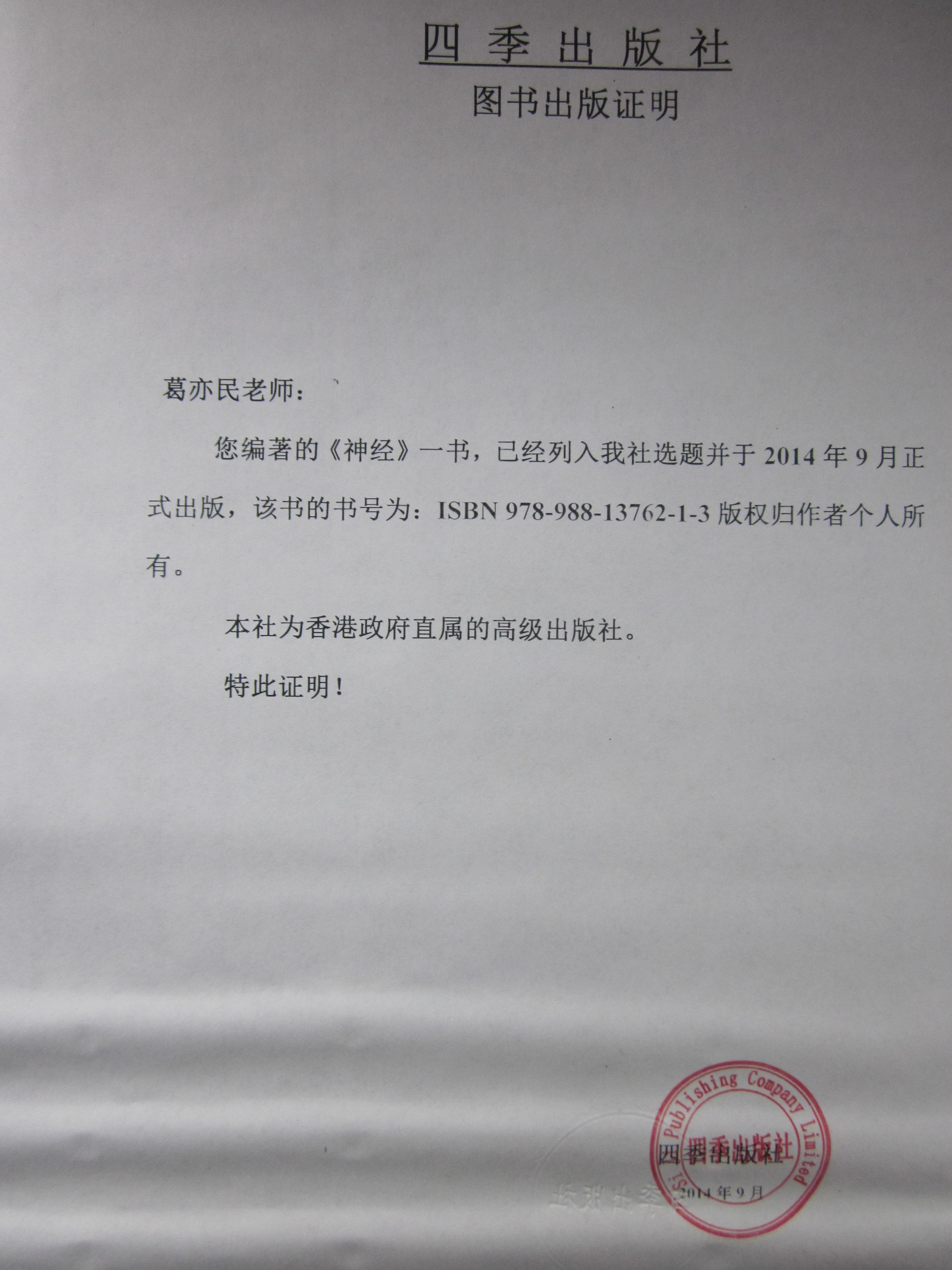 新闻荣誉第1季 新闻荣誉第2季1、神经第一版已于2014年9月在香港四季出版社出版,书号:ISBN978-988-13762-1-3 神经已在香港特区政府康乐及文化事务署书刊注册组注册。 )1、